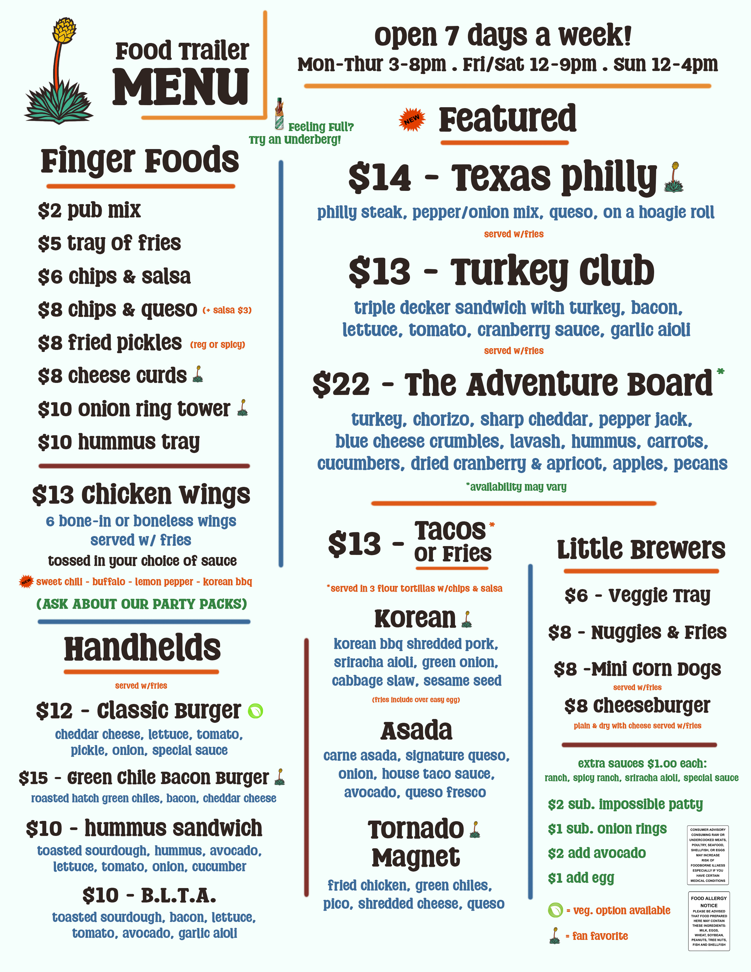 The Pondaseta Food Trailer is serving up great tasting, made to order food, 7 days a week. Indulge in our perfectly cooked burgers made with top-quality ingredients, or try our tacos, — now available as loaded fries for a creative twist. Pair your meal with one of our craft beers, from crisp lagers to bold IPAs, expertly recommended by our bartenders to complement your dish. We love to experiment with different flavors and ingredients, so there's always something exciting to try. Join us for a meal, and let us treat you to a delicious experience you won't forget!